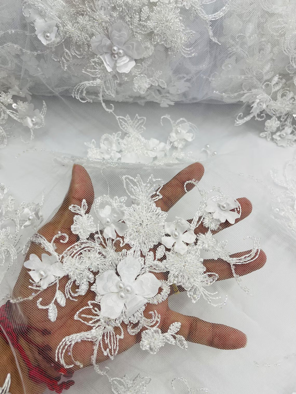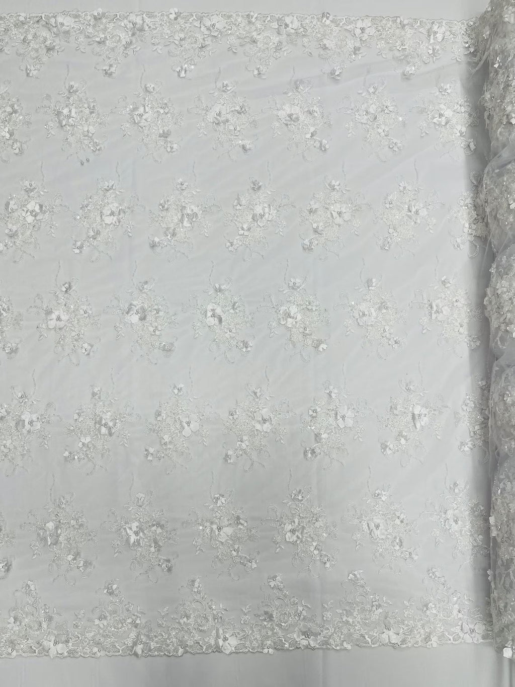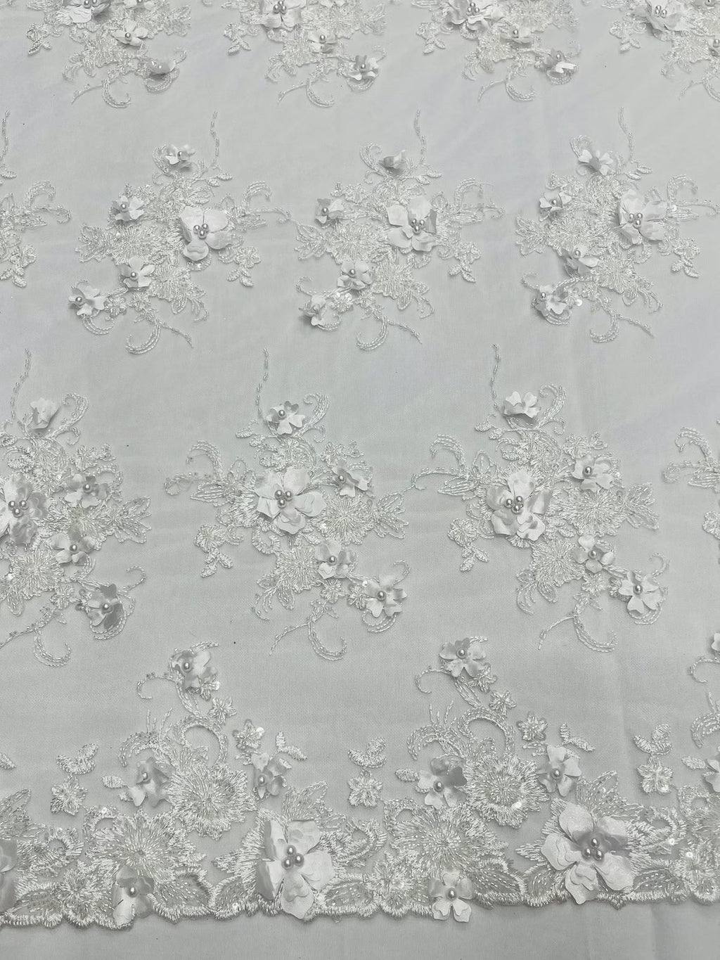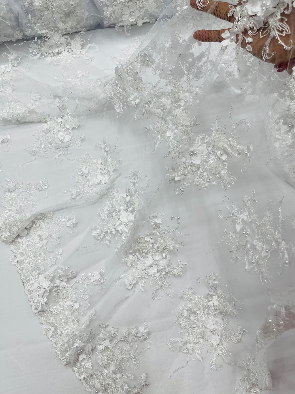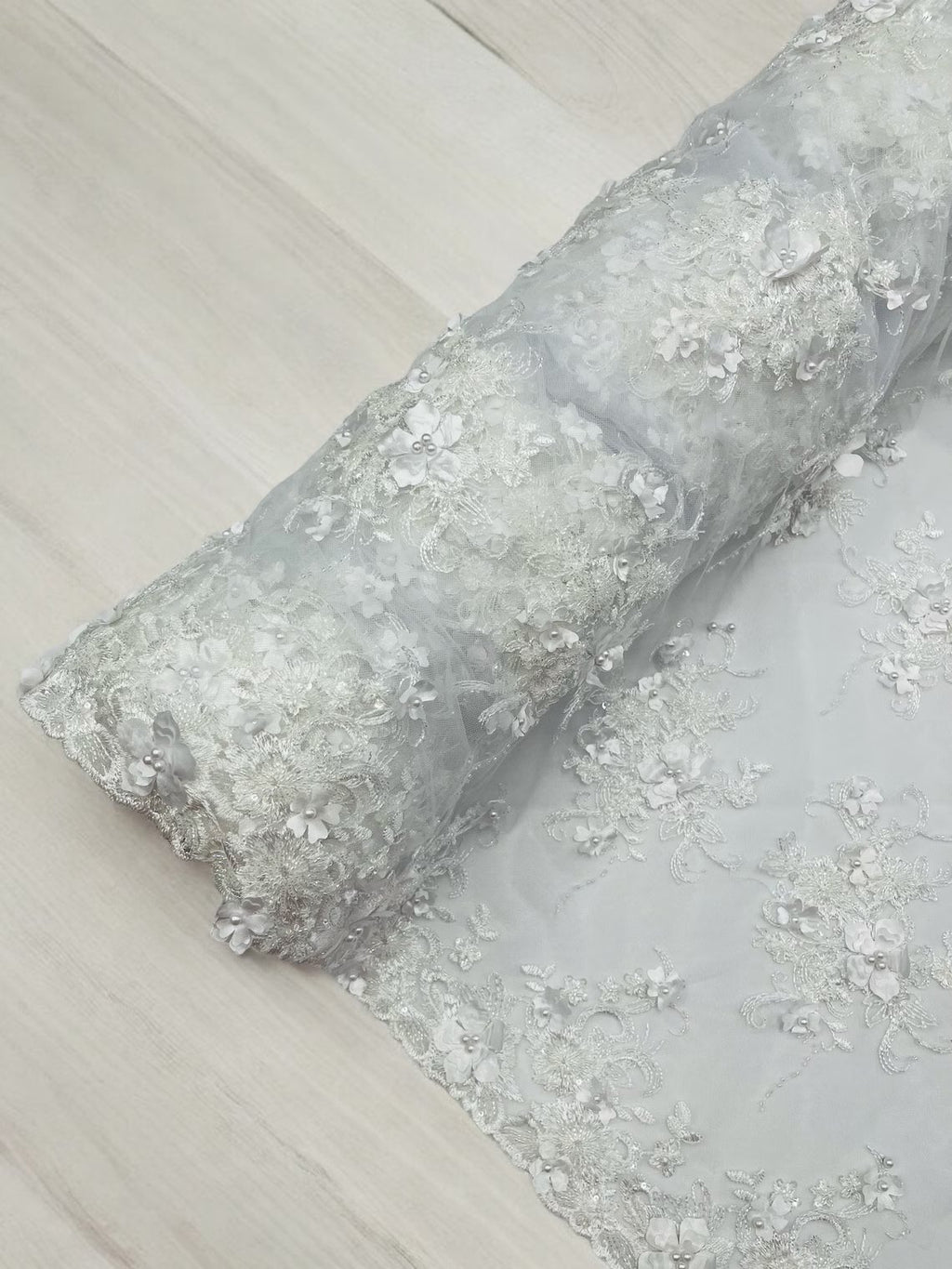 This elegant fabric features a stunning combination of 3D floral design, sequins, and pearl beads on a delicate mesh lace. The intricate lace is embellished with a beautiful floral border and additional floral accents, making it perfect for a variety of uses such as dresses, tablecloths, runners, nightgowns, fashion apparel, decor, prom dresses, bridesmaid dresses, and more. Its versatile design and high-quality materials make it a must-have for any fashion or crafting project.