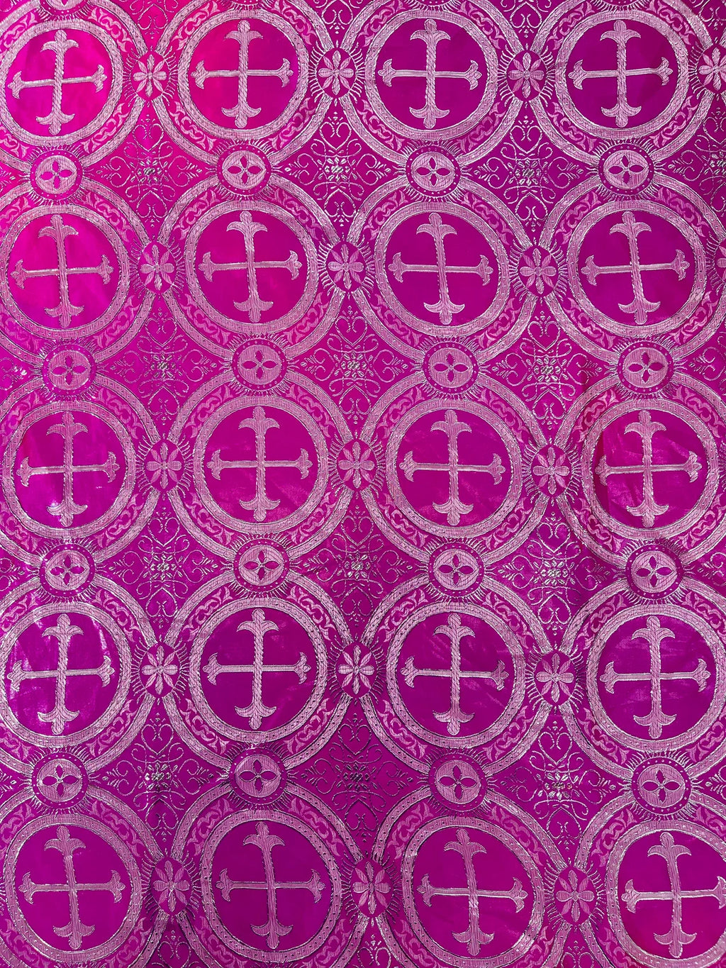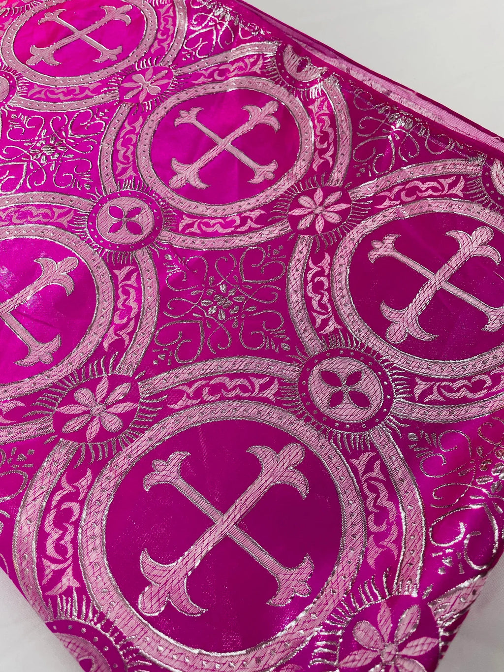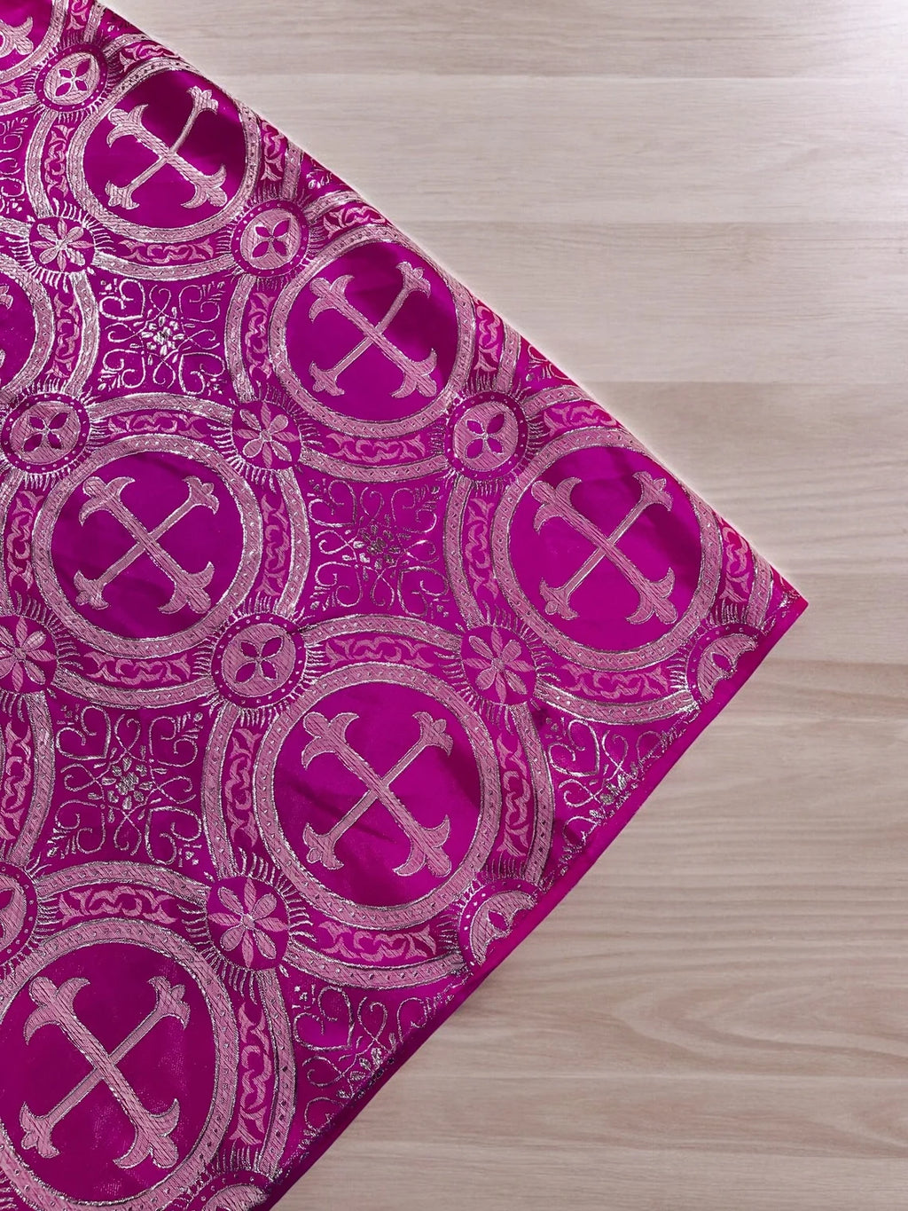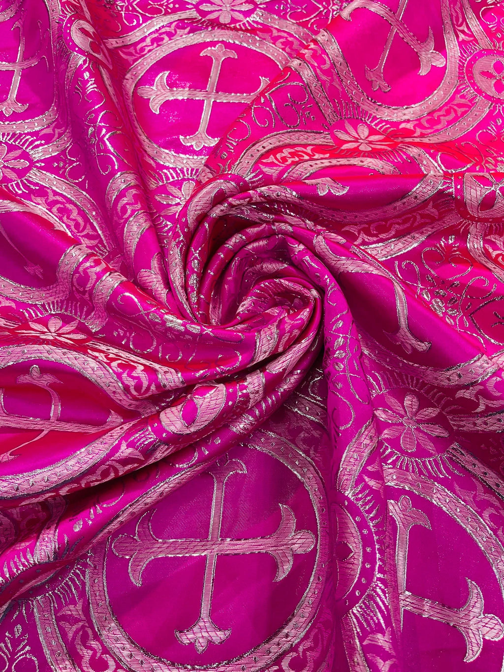 Brocade Cross Fabric - Fuchsia / Silver - Church Vestment Cross Religious Jacquard Fabric By Yard
