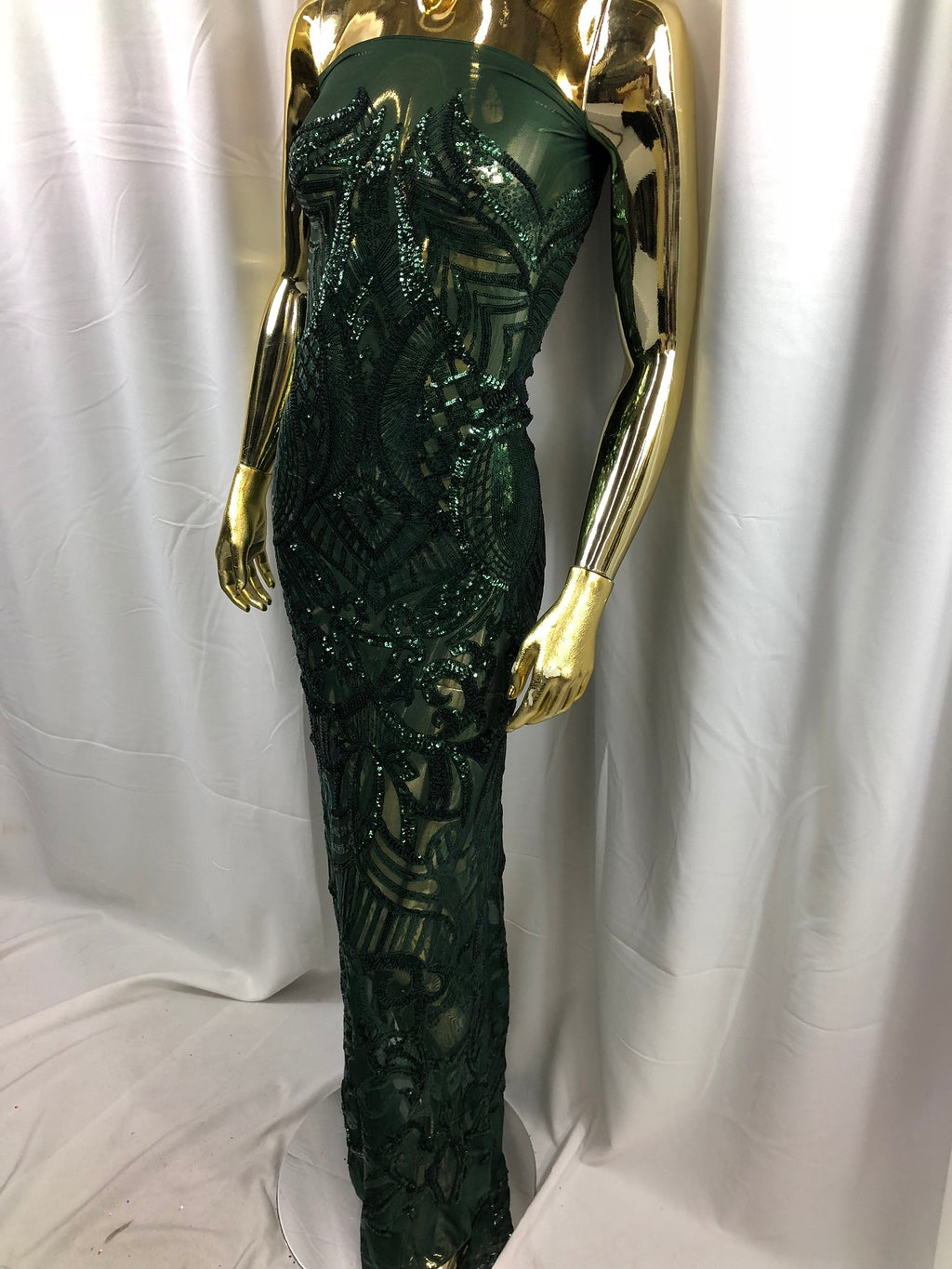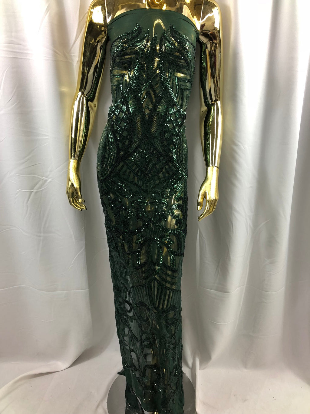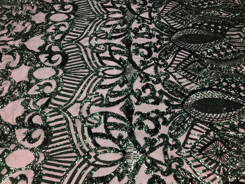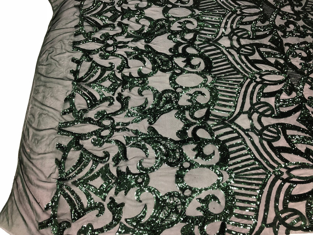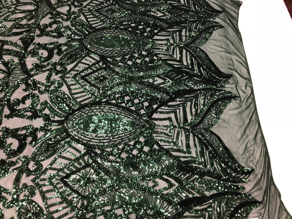 Hunter Green - 4 Way Stretch Embroidered Royalty Sequins Design Fabric By Yard