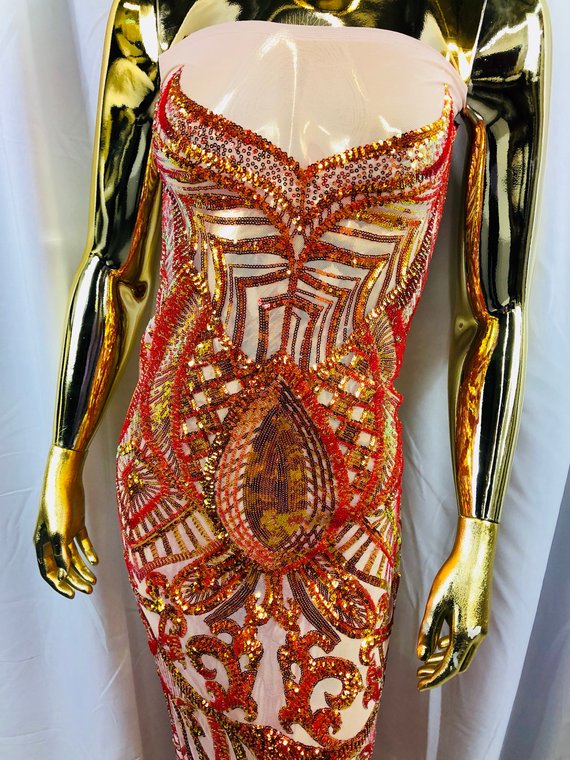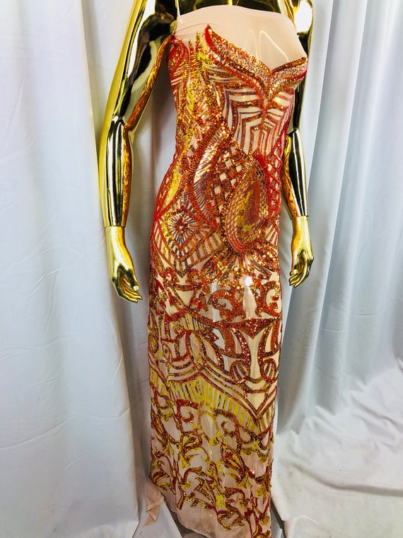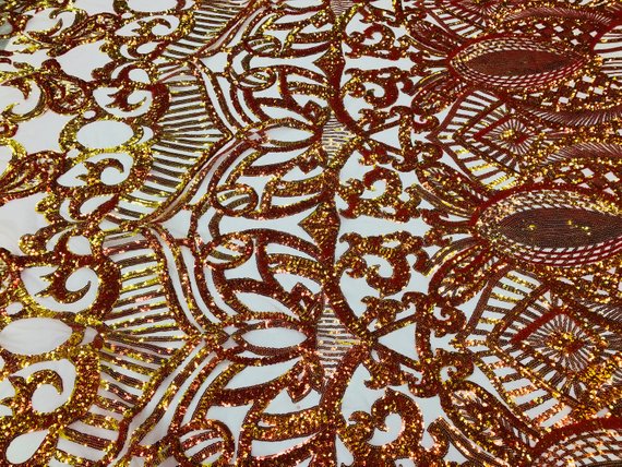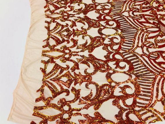 Iridescent Orange Sequins - 4 Way Stretch Embroidered Royalty Sequins Design Fabric By Yard