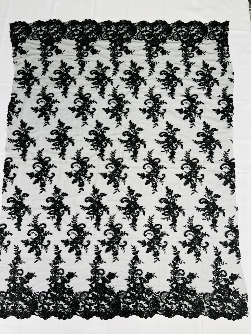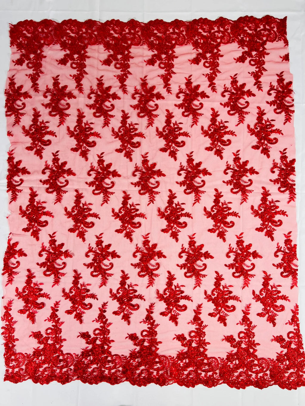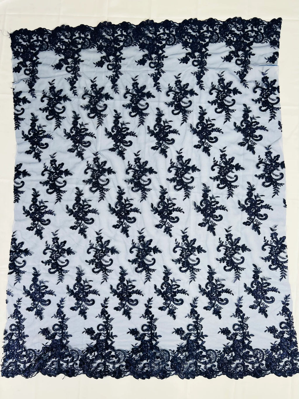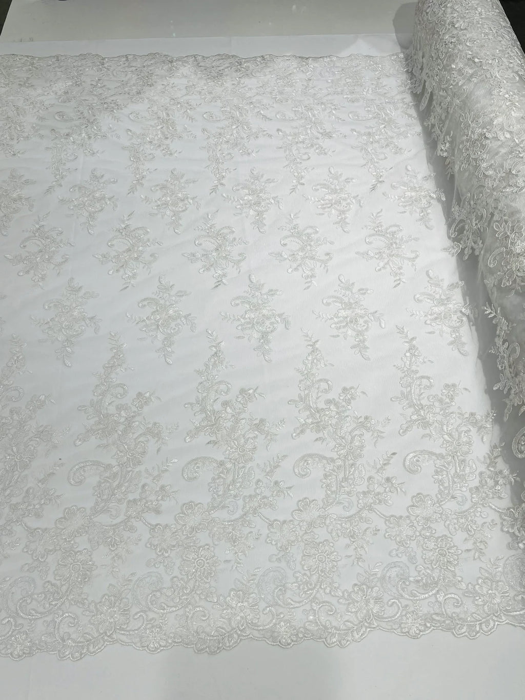 Lace Flower Cluster Fabric - Embroidered Flower With Sequins on a Mesh Lace Fabric - 25 Yard Roll