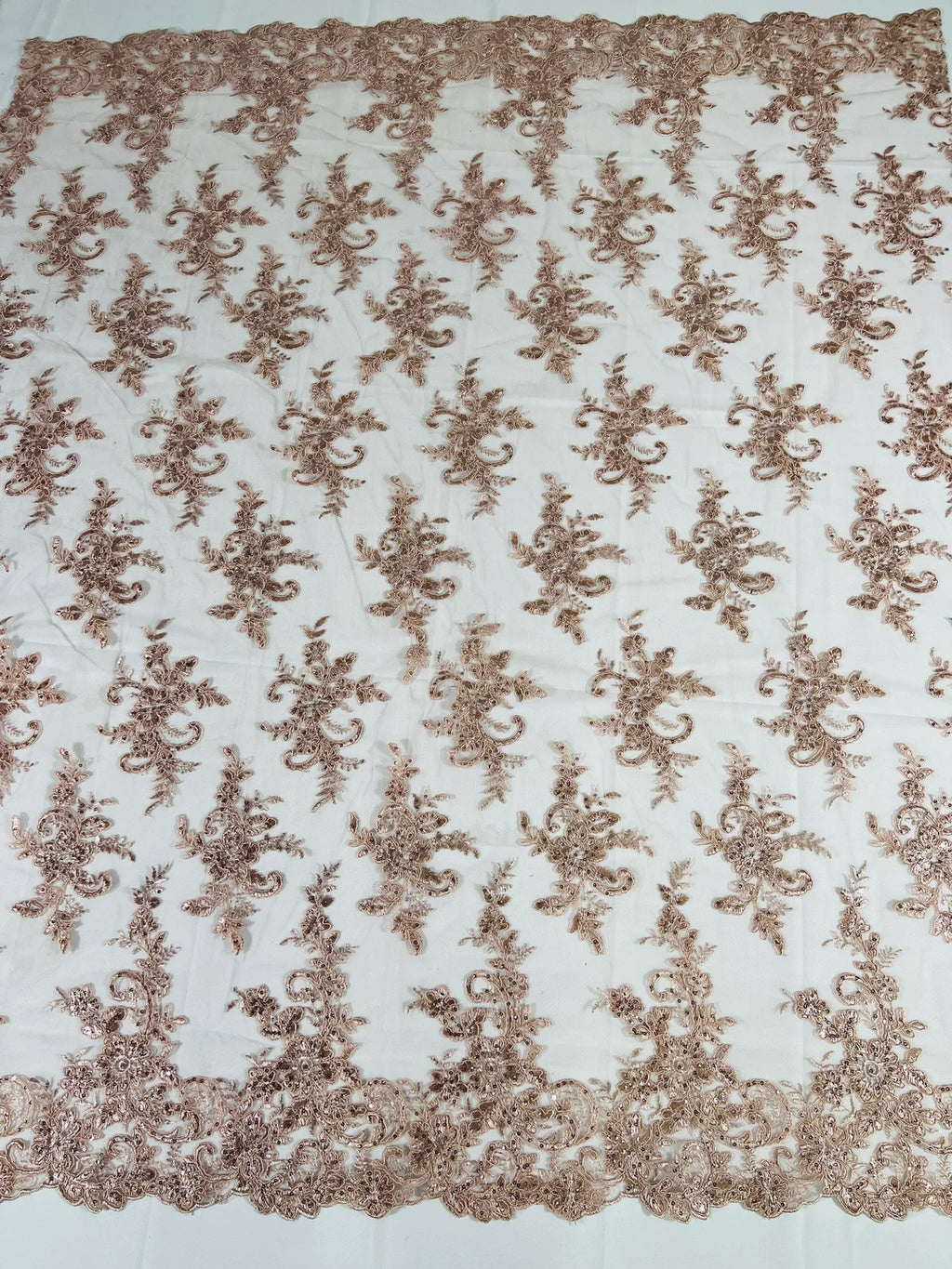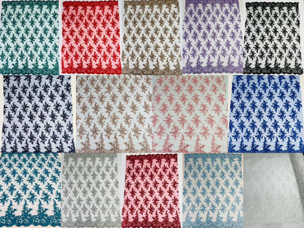 The flowers are embroidered with sequins on a mesh lace fabric giving off a sophisticated and elegant look . This lace can be used for dresses, tablecloths, nightgowns, prom gowns, bridesmaid gowns, wedding gowns, table covers/runners, pillows, home /event decorations, and much more.