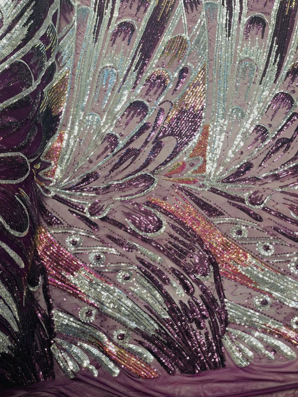 This beautiful design is embroidered with sequins on a 4 way stretch spandex mesh fabric.  The sequins are arranged in a beautiful multi-color pattern.