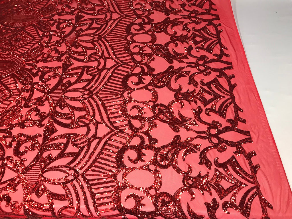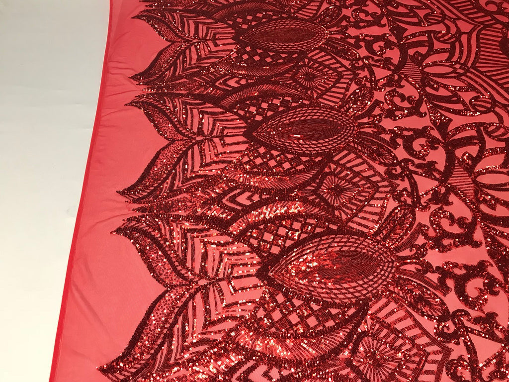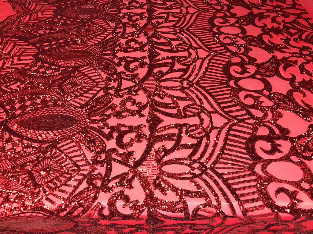 Red Sequin - 4 Way Stretch Embroidered Royalty Sequins Fancy Design Fabric By Yard